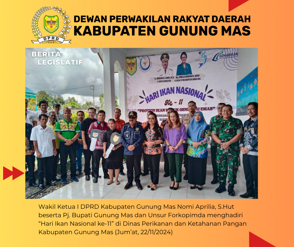 BERITA LEGISLATIF – Kuala Kurun – Wakil Ketua I DPRD Kabupaten Gunung Mas Nomi Aprilia, S.Hut menghadiri acara “HARI IKAN NASIONAL KE-11” yang dilaksanakan oleh Dinas Pertanian dan Ketahanan Pangan Kabupaten Gunung Mas. Kegiatan ini dibuka langsun oleh Pj. Bupati Gunung Mas Ir. Herson B. Aden, M.Si dan acara ini dihadiri unsur Forkopimda Kabupaten Gunung Mas, Sekretaris Daerah, Asisten I Sekda, Kepala Perangkat Daerah, Ketua TP-PKK Kabupaten Gunung Mas dan para tamu undangan. (Jum’at, 22/11/2024)